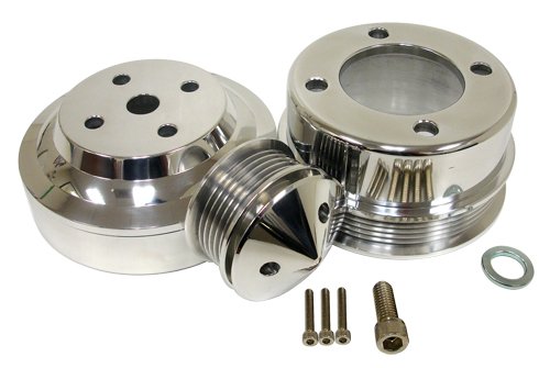 Polished billet aluminum 6 groove serpentine alternator, crank and water pump pulley set. The pulleys are CNC-machined from the lightest, most durable materials possible: 6061-T6 billet aluminum.